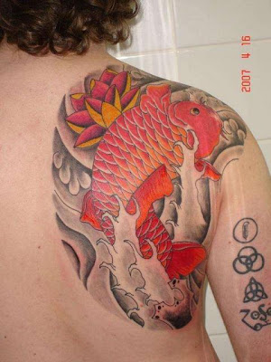 A Japanese boy being tattooed traditional koi tattoo on his arm.